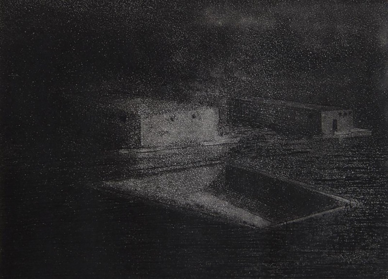 در آثار نسیم حسنزاده نیز با نمایی دور از ساختمانها مواجه هستیم اما به نظر میرسد چاردیواری در این آثار نه خانه که انبار و سوله و کارخانه و... است. ساختمانهای کوچک و بزرگی که در فضایی باز و دورافتاده قرار دارند و در ساعات شب خالی از حیات به نظر میرسند.