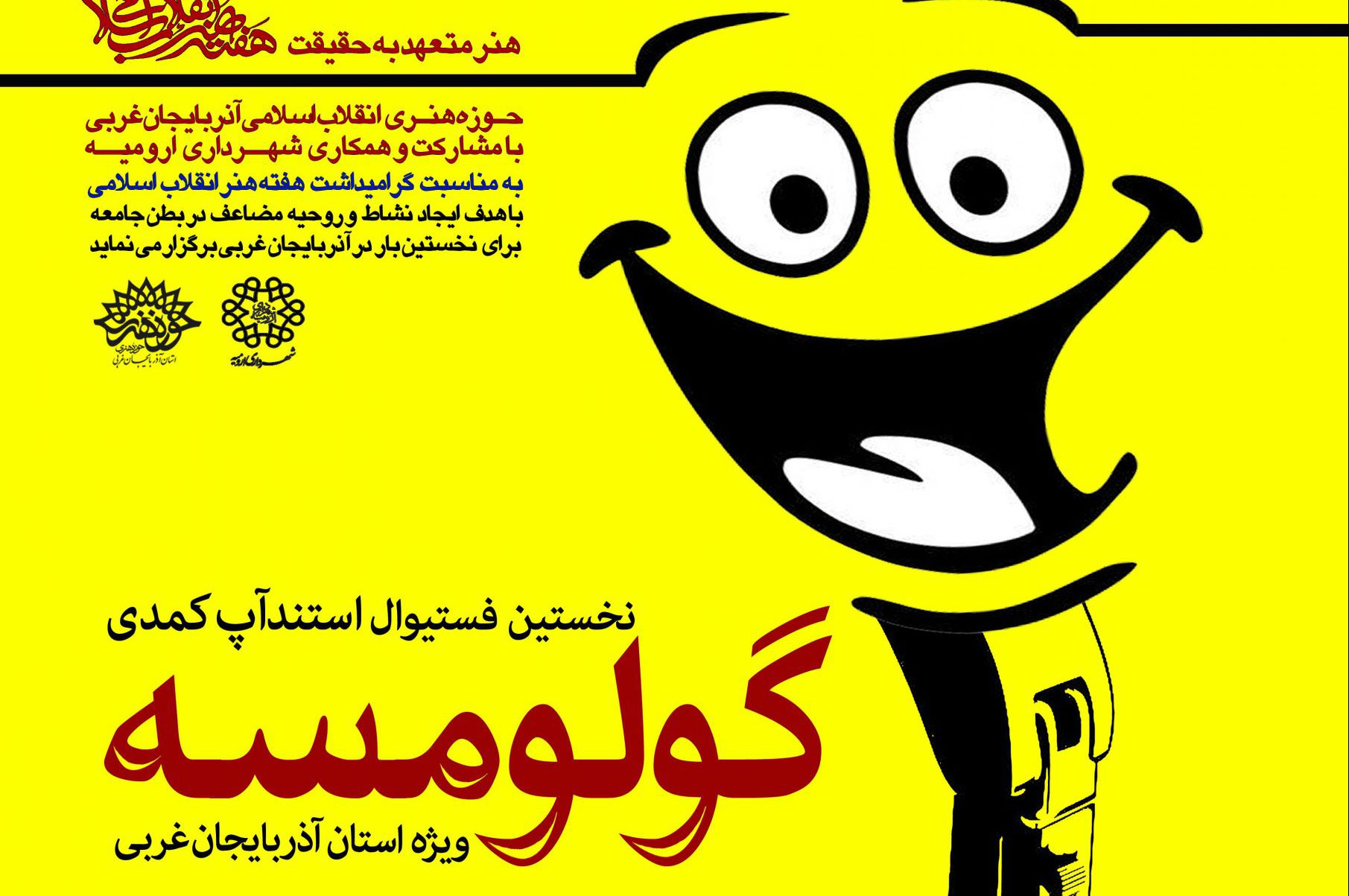 به گزارش روابط عمومی دفتر طنز حوزه هنری برای نخستین بار در استان آذربایجان غربی، جشنواره استندآپکمدی «گولومسه» با مشارکت و همکاری حوزه هنری انقلاب اسلامی آذربایجان غربی و شهرداری ارومیه در شهرستان ارومیه برگزار میشود .