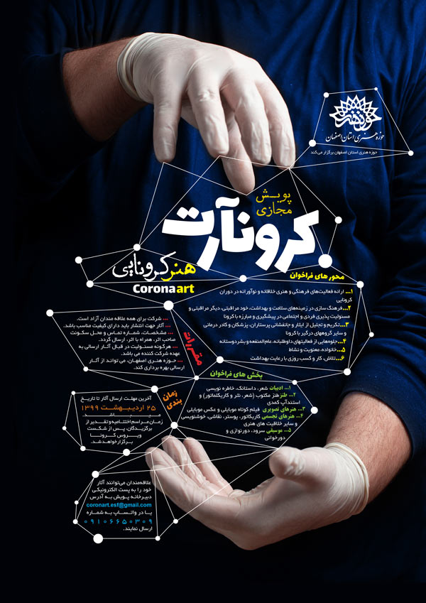 به گزارش روابط عمومی حوزه هنری استان اصفهان، فراخوان پویش هنری کورونآرت (هنر کروناییCorona art ) منتشر شد. این فراخوان از تمامی هنرمندان در رشتههای مختلف هنری دعوت میکند تا در ایام قرنطینه به آفرینش و خلق آثار هنری بپردازند.