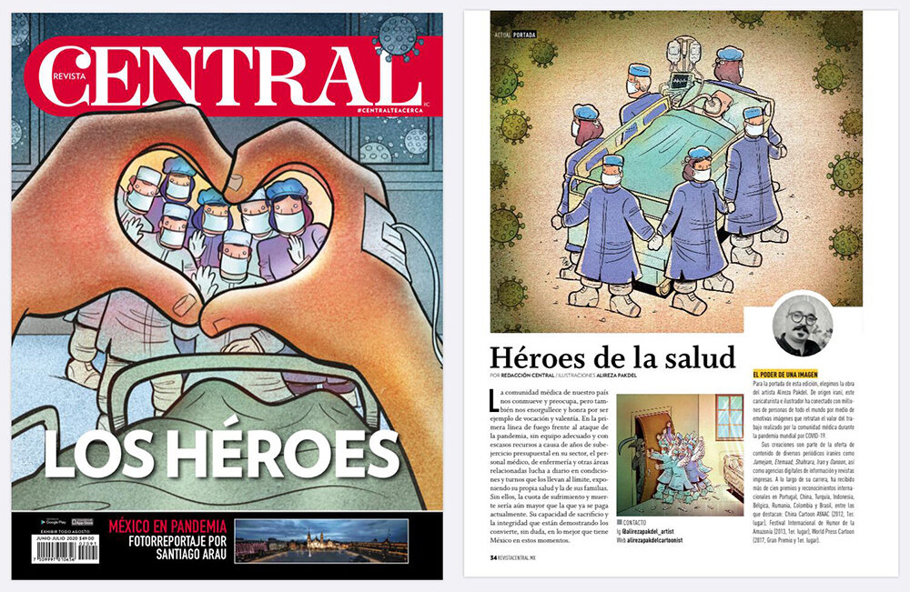 به گزارش روابط عمومی مرکز تجسمی حوزه هنری به نقل از مهر، پس از بازتاب جهانی کارتونهای علیرضا پاکدل هنرمند جوان با محوریت «مبارزه با بیماری کرونا»، «مبارزه کادر درمانی با کرونا» و «در خانه بمانیم» و همچنین معرفی این هنرمند ایرانی در اینستاگرام، این بار شماره جدید مجله سنترال در کشور مکزیک، بخش ویژهای را به آثار مقابله با کرونای علیرضا پاکدل روی جلد و در صفحات داخلی اختصاص داده است.