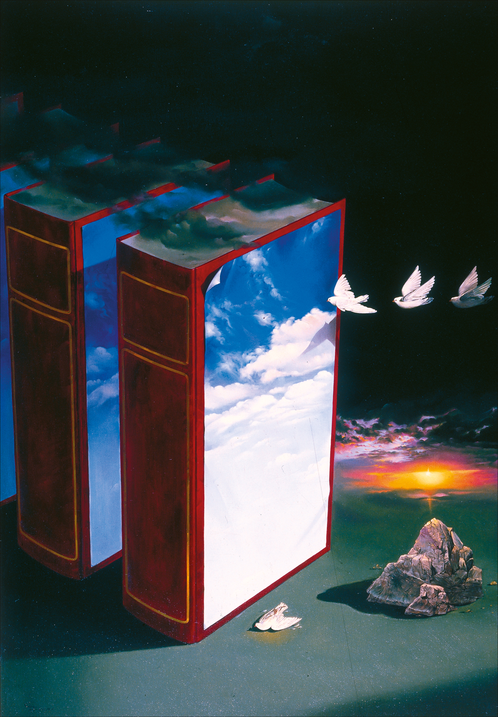 پرنده و کتاب / مرتضی کاتوزیان / 75 × 100 / رنگ و روغن روی بوم / 1362