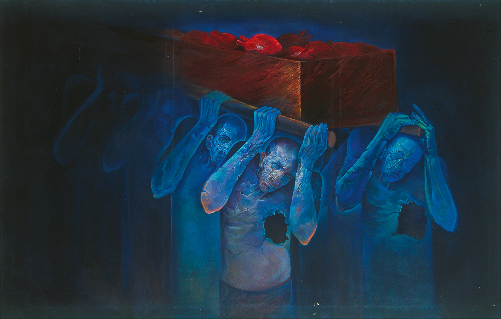 تشییع قلوب / حبیبالله صادقی / 170 × 110 / رنگ و روغن روی بوم / 1363