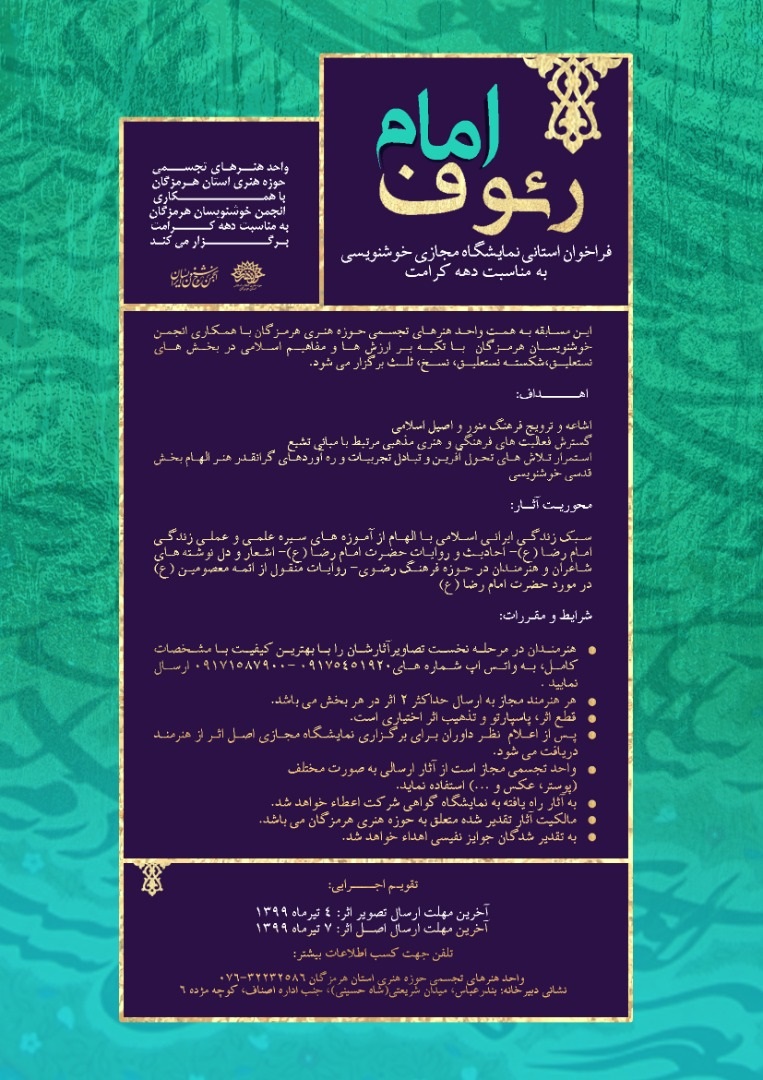 وی در ادامه بیان داشت : فراخوان نمایشگاه مجازی خوشنویسی«امام رئوف» در بخش های نستعلیق ، شکسته نستعلیق ، نسخ و ثلث برگزار می شود و علاقهمندان به شرکت در این نمایشگاه می توانند تصویر اثر خود را تا 2 تیر ماه و اصـل اثر را نیز تا 5تیرماه 1399 به واحد هنرهای تجسمی حوزه هنری استان هرمزگان ارسال کنند.