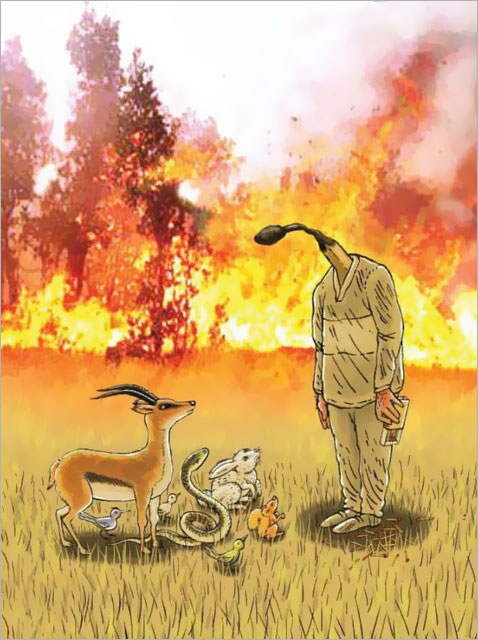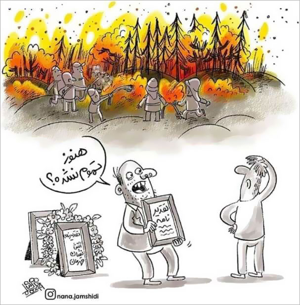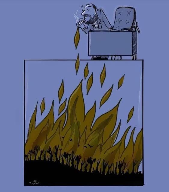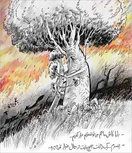 به گزارش روابط عمومی مرکز تجسمی حوزه هنری به نقل از ایسنا، در میان سیل اخبار غمانگیز آتشسوزیها، برخی از هنرمندان دست به قلم شدند و با کشیدن کاریکاتورهایی ناراحتی، نگرانی و گاهی اعتراضشان را برای از دست دادن ذخایر سبز زاگرس به زبان هنر مطرح کردهاند.