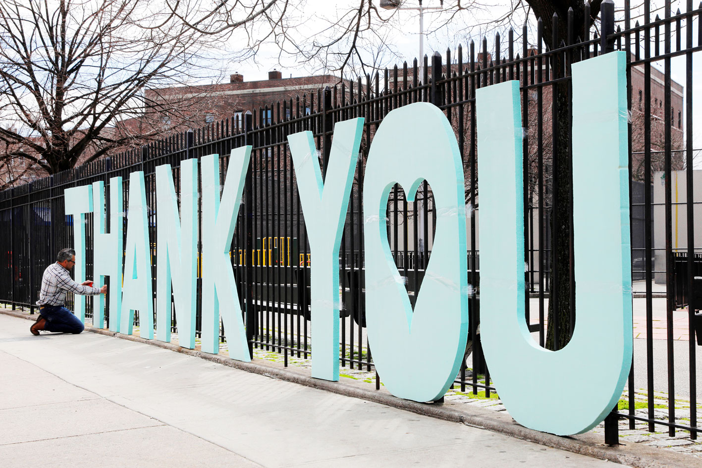 حمایت گسترده و قدردانی از کادر درمانی به عنوان مبارزان اصلی با ویروس کرونا، در سراسر جهان به عنوان یک ضرورت برای همراهی صورت گرفته است. در عکس بالا مردی را میبینیم که در حال نصب یک «تشکر» بزرگ برای کارمندان بهداشت و درمان در مرکز بیمارستان المورست در نزدیکی کوئینز، واقع نیویورک سیتی است.