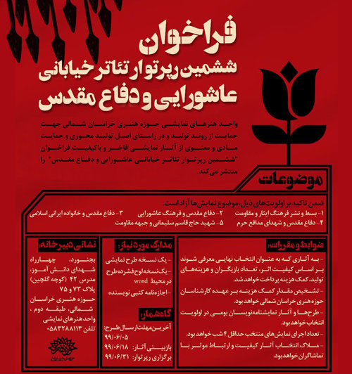 بجنورد، چهارراه شهدای دانش آموز، مدرس ۴۲ (کوچه گلچین) پلاک ۷۳ و 75 حوزه هنری خراسان شمالی طبقه دوم واحد هنرهای نمایشی، تلفن 0583288113