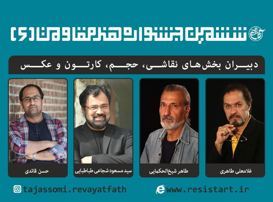 ششمین جشنواره جهانی هنر مقاومت در هشت بخش نقاشی، کارتون، حجم، عکس، پرچم و کتیبه، تایپوگرافی، تصویرسازی، عکس توسط گروه هنرهای تجسمی بنیاد فرهنگی روایت فتح، بهمن ماه سال جاری در تهران برگزار خواهد شد.