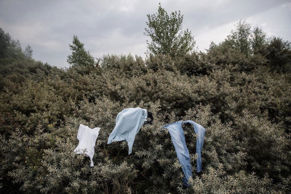 خشک کردن لباسهای مهاجران کمپ موقت حومه شهر «کاله»(فرانسه) روی درختان / منبع: خبرگزاری فرانسه