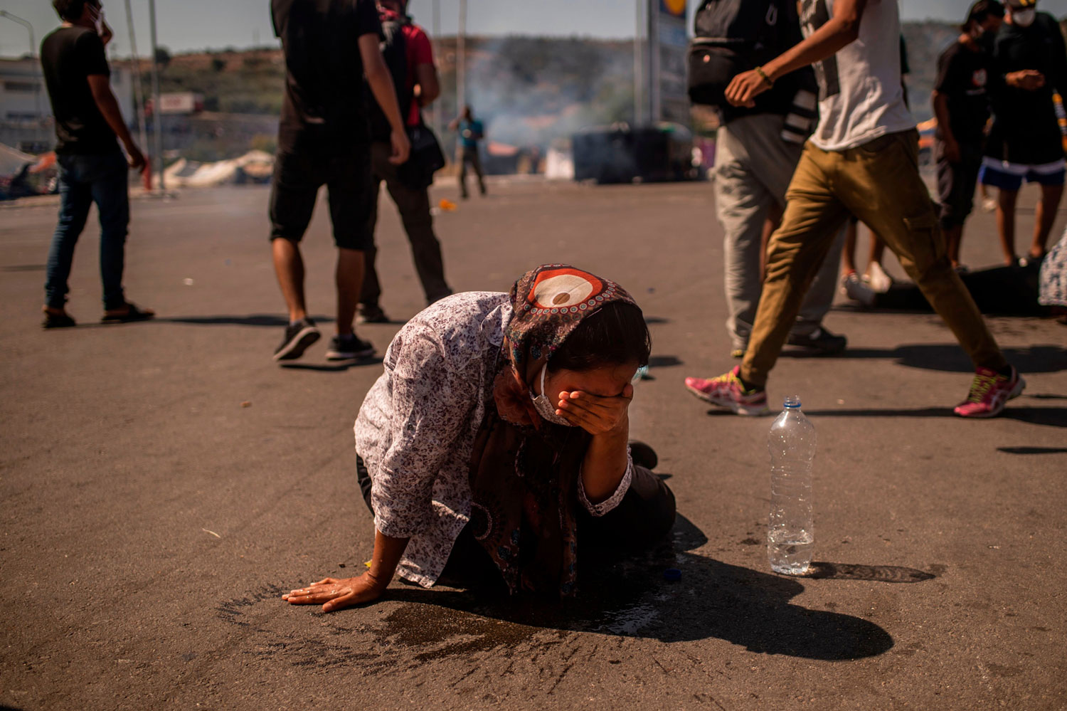 یک زن پس از پرتاب گاز آشکآور توسط پلیس چشمهایش را با آب میشوید. پس از آنکه کمپ «ماریو» در یونان در آتش سوخت، پلیس به سمت مهاجرانی که در اعتراضات برای درخواست پناهگاه سنگپرتاب میکردند، گاز اشکآور پرتاب کرد /