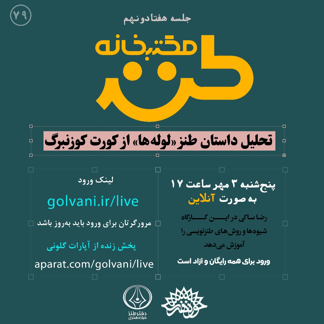 به گزارش روابط عمومی دفتر طنز حوزه هنری 79ﺍُمین ﺟﻠﺴﻪ «ﻣﮑﺘﺐﺧﺎﻧﻪ ﻃﻨﺰ» پنجشنبه سوم مهرماه 1399 ساعت 17 به صورت مجازی ﺑﺮﮔﺰﺍﺭ میشود.
