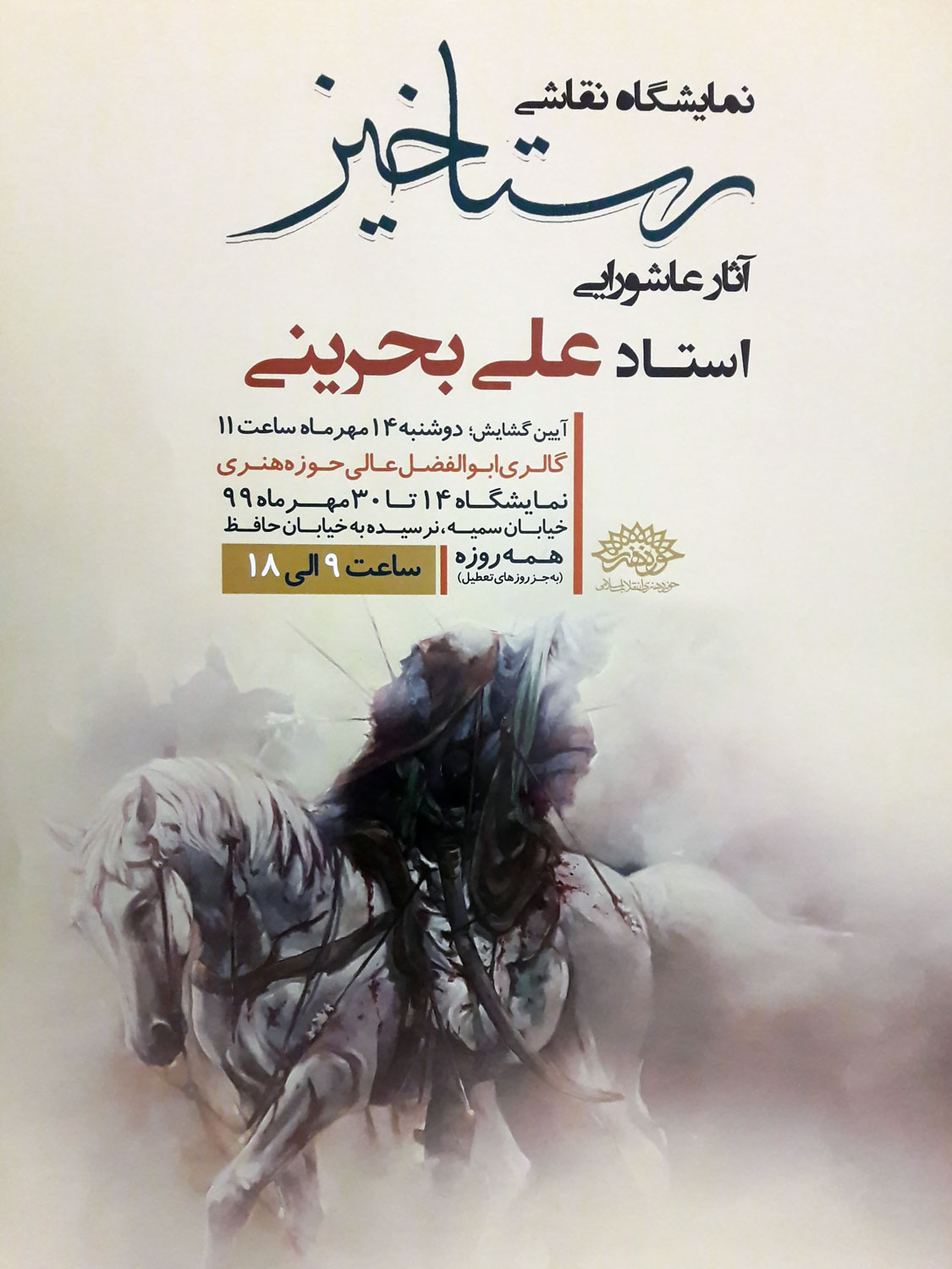 درهای این نمایشگاه از 14 تا 30 مهرماه و از ساعت 9 الی 18 به روی هنردوستان باز میباشد.