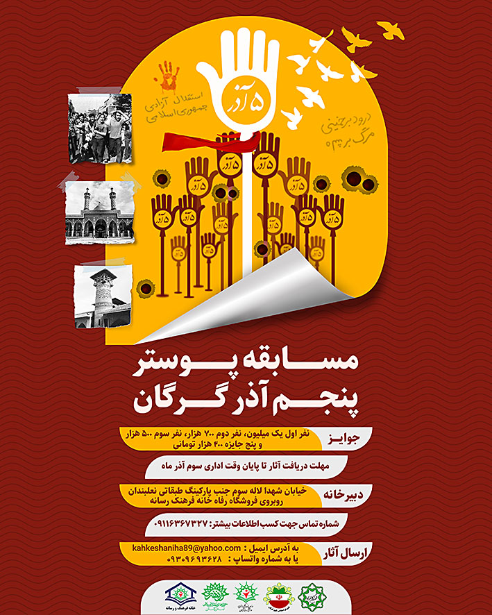 به گزارش روابط عمومی حوزه هنری استان ، مسئول واحد هنرهای تجسمی این مرکز درباره خبر فوق گفت:فراخوان مسابقه پوستر با موضوع واقعه پنجم آذر گرگان منتشر شده و هنرمندان گرافیست می توانند آثار خود را تا سوم آذرماه به آدرس الکترونیکی kahkeshaniha89@yahoo.com ،شماره واتس آپ 09116367327ویا نشانی گرگان،خیابان شهداء، لاله سوم ،جنب پارکینگ طبقاتی نعلبندان،خانه فرهنگ رسانه ارسال کنند.