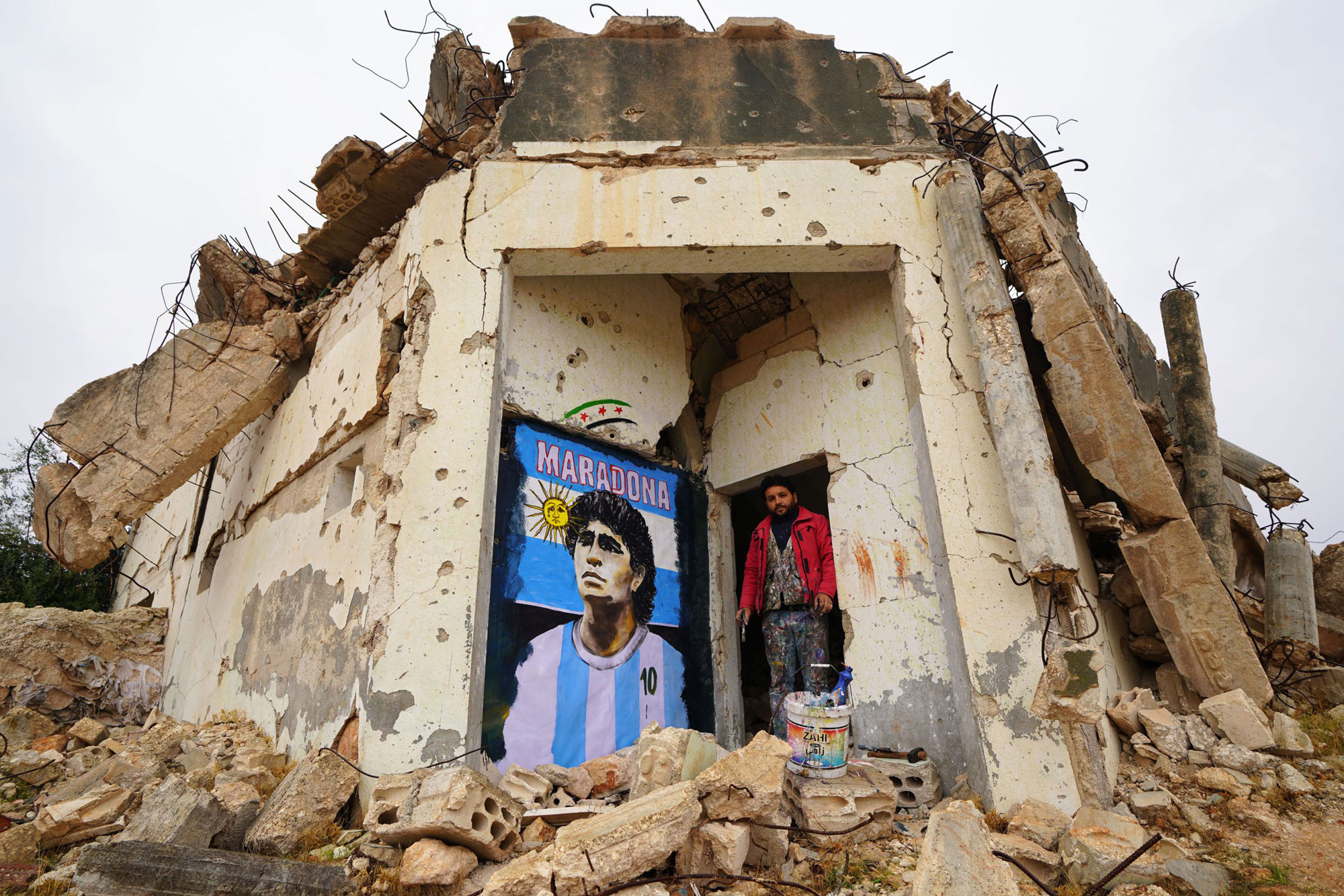 هنرمندی به نام «عزیز اسمر» در کنار نقاشی از مارادونا ایستاده است / سوریه - خبرگزاری فرانسه