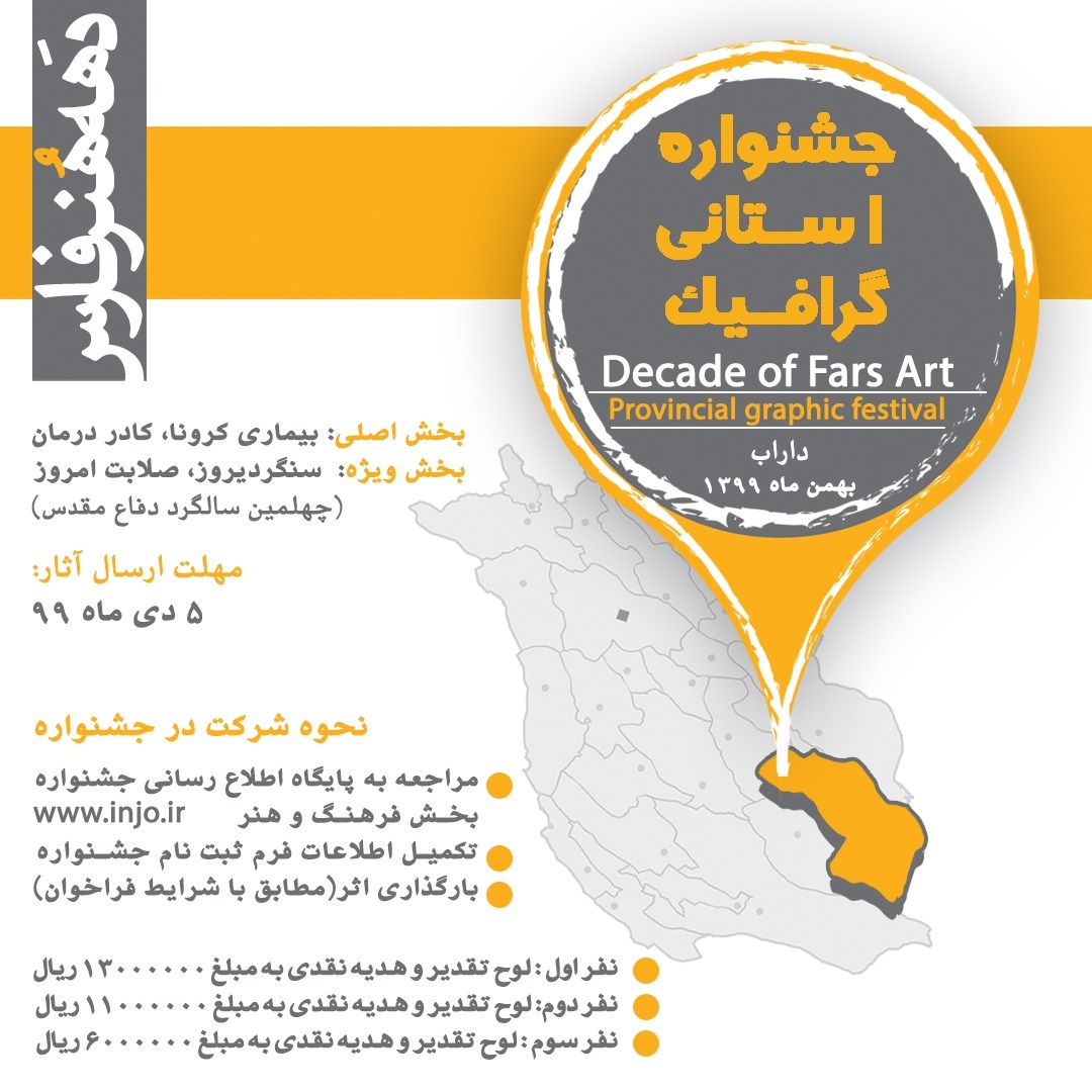 به گزارش روابط عمومی مرکز تجسمی حوزه هنری، جشنواره استانی گرافیک در بهمن ماه 1399 در داراب برگزار می شود. این جشنواره که به طور مجازی برگزار خواهد شد در ده رشته متفاوت برگزار می شود که هر رشته شامل دو بخش اصلی با موضوع کرونا، کادر درمان و بخش ویژه با موضوع سنگر دیروز، صلابت امروز (چهلمین سالگرد دفاع مقدس) است.
