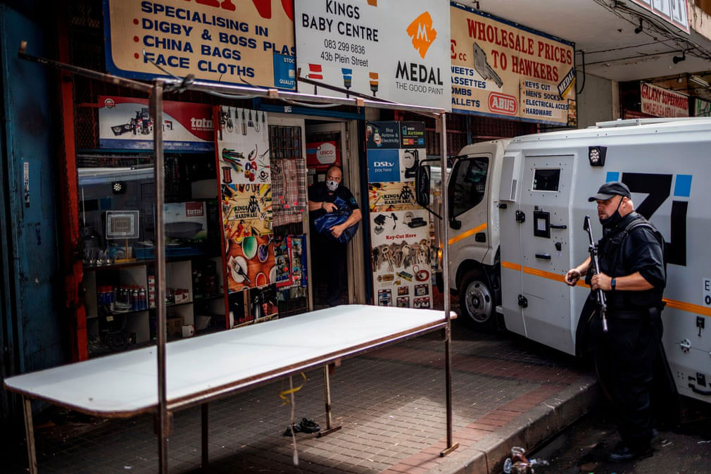 انتقال پول توسط مامور درحالی که مامور دیگر برای مقابله با خطرهای احتمالی در مقابل سوپرمارکتی واقع در «ژوهانسبورگ» ایستاده است. با وجود قرنطینه ناشی از ویروس کرونا در آفریقای جنوبی در سال جاری چندین مورد سرقت حین انتقال پول رخ داد است. / آفریقای جنوبی - خبرگزاری فرانسه