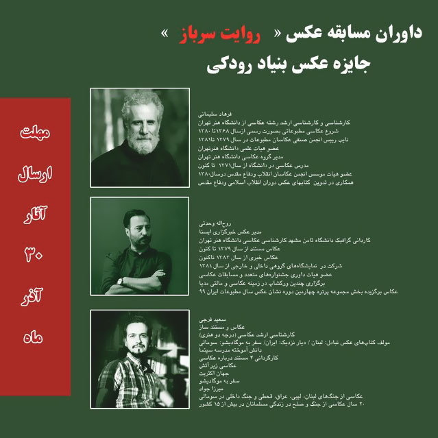 به گزارش روابط عمومی مرکز تجسمی حوزه هنری به نقل از روابط عمومی و امور بینالملل بنیاد روکی، سعید فرجی، فرهاد سلیمانی و روح الله وحدتی«روایت سرباز» را به دبیری حمید فروتن داوری میکنند.