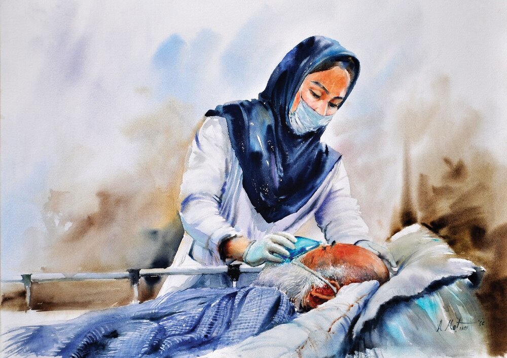احمد مطیع، هنرمند اصفهانی، در یک تابلوی آبرنگ واقع‌گرایانه به نمایش پرستاری پرداخته است که در حال مراقبت از شخص بیمار است.