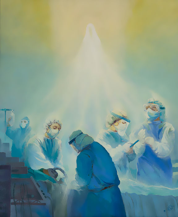 عبدالحمید قدیریان در تابلویی با عنوان «شفا» گروهی از پزشکان و پرستاران را بالای سر یک بیمار نشان داده است، درحالی‌که فضای سبز و آبی اتاق با نوری سفید و زرد روشن شده و نیرویی روحانی به کمک آنها آمده است.