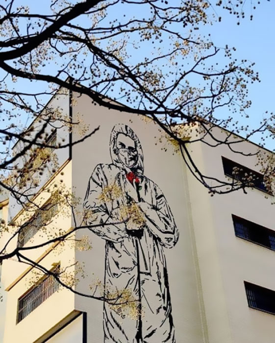 حسین معینی‌فر، هنرمند شیرازی با اجرای چند نقاشی دیواری به قدردانی از مدافعان سلامت پرداخته است. در یکی از آثار او که بر دیوار بیمارستان سعدی شیراز نقاشی شده است، پرستاری را با پوشش محافظ سراسری می‌بینیم که شاخه گلی به دست دارد.