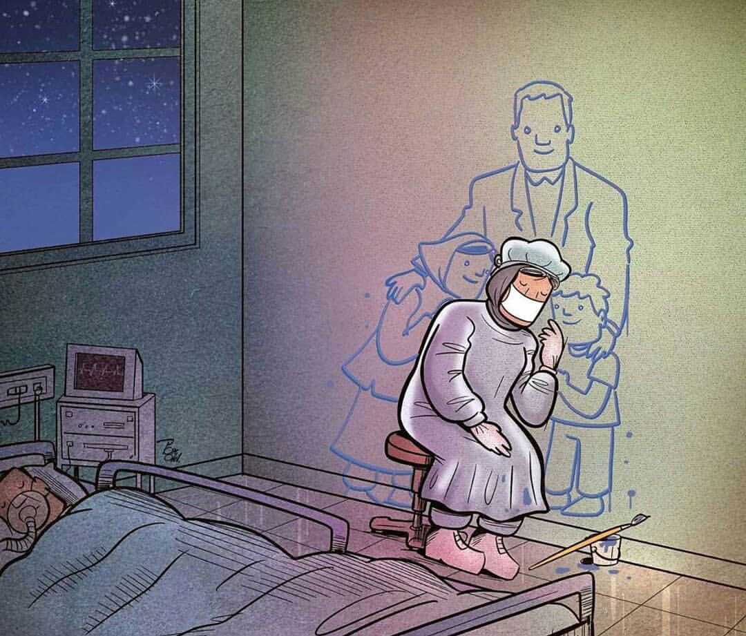 علیرضا پاکدل از هنرمندانی است که کارتون‌های متعددی در ارتباط با بیماری کرونا منتشر کرده است. او در یکی از آثاری که به موضوع کادر درمان اختصاص دارد، پرستاری را در کنار بالین بیمار نشان می‌دهد که در رویا، خانواده خود را می‌بیند.
