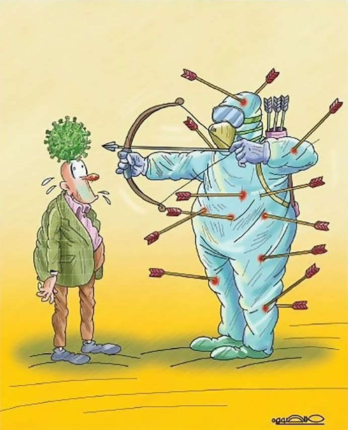 حمید صوفی نیز از دیگر کارتونیست‌هایی است که آثار زیادی با این موضوع به تصویر کشیده است و در یک اثر یکی از مدافعان سلامت را نشان می‌دهد، درحالی‌که خود مورد تهاجم بیماری قرار گرفته است اما باز هم تلاش می‌کند دیگران را از خطر بیماری نجات دهد.