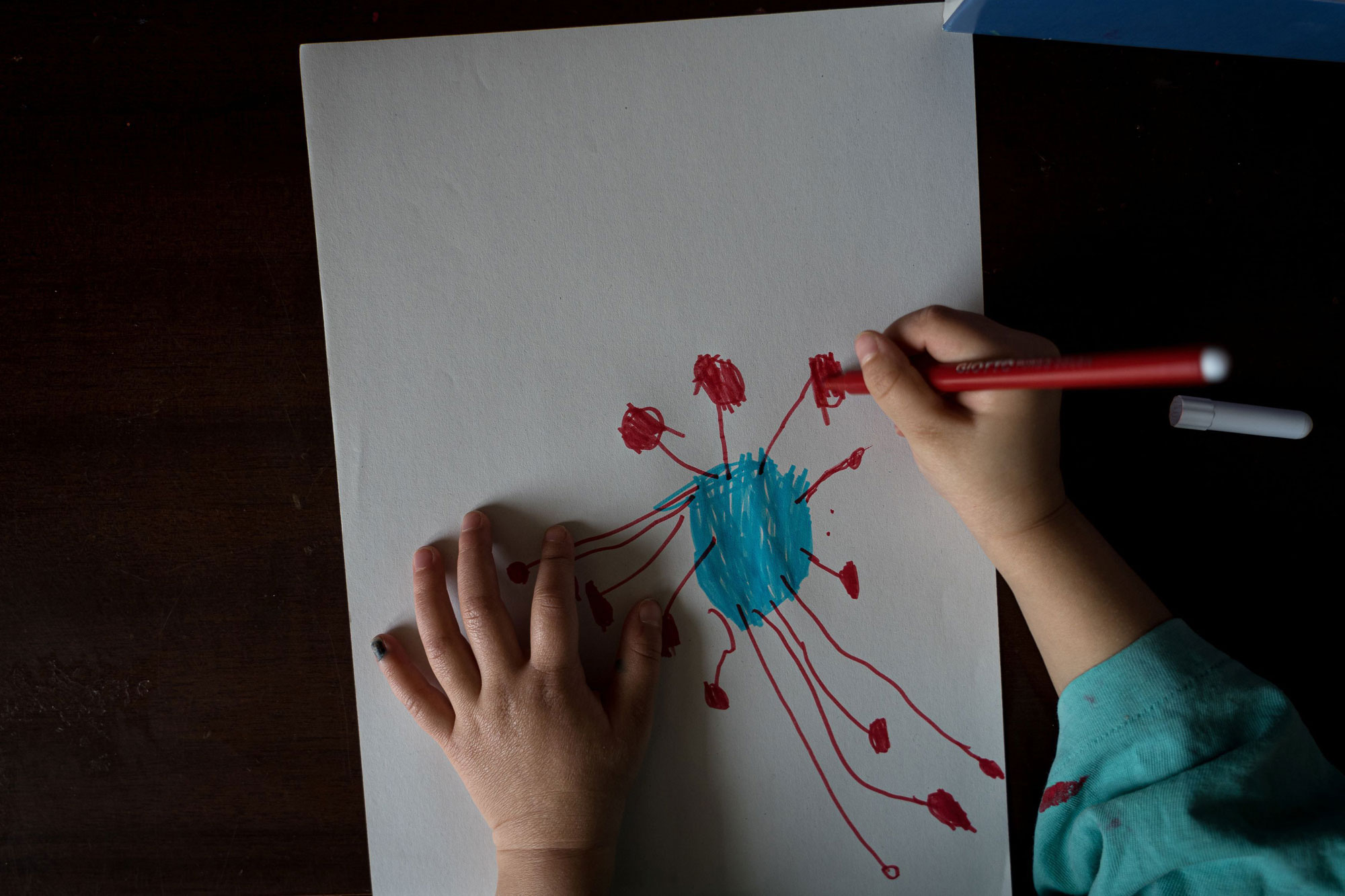 یک کودک دوساله در چهاردهمین روز از قرنطینه خانگی تصویر میکروسکوپی از ویروس کرونا را نقاشی میکند / ایتالیا / ۵ مارس ۲۰۲۰