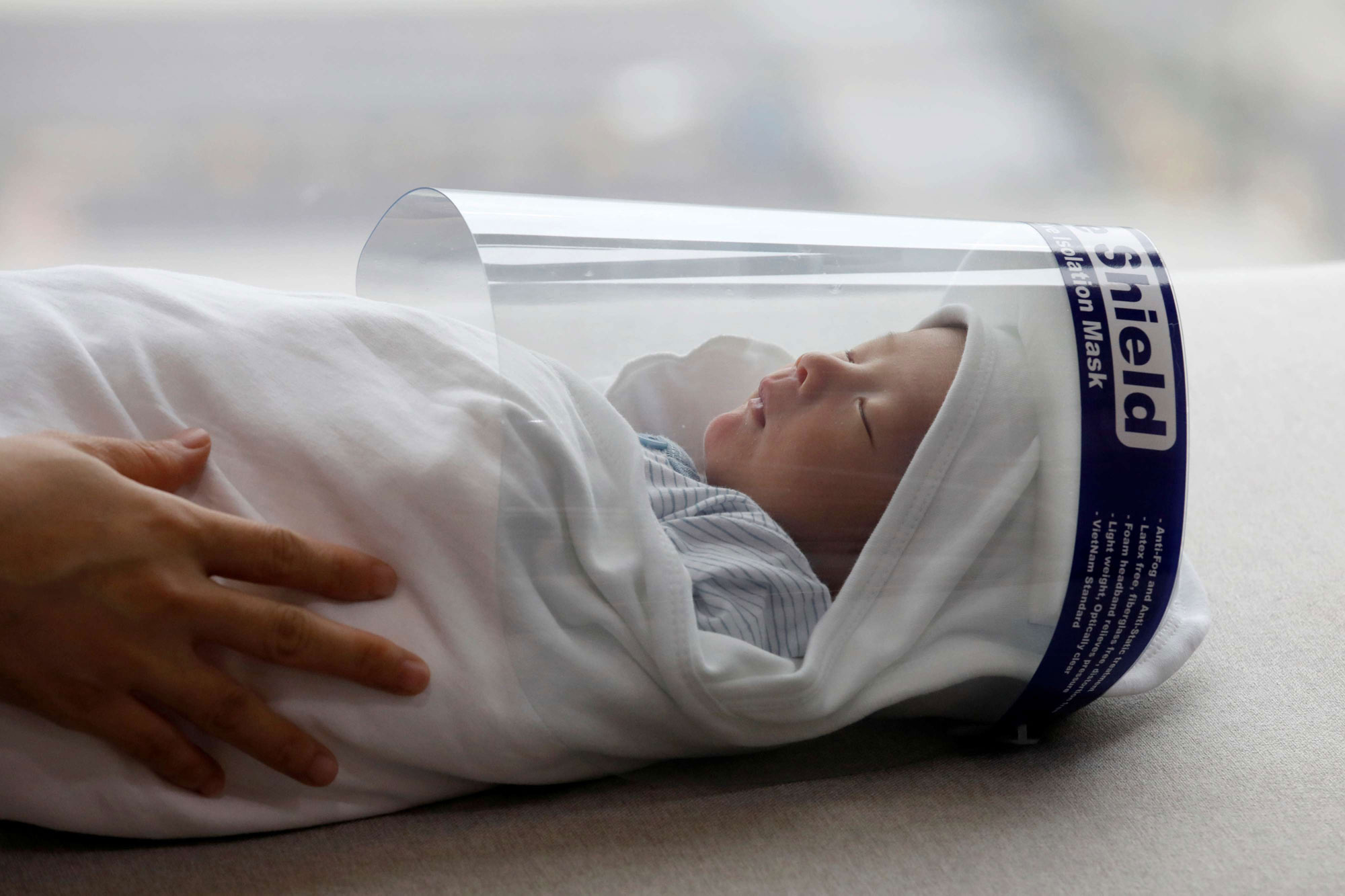 یک شیلد صورت بر روی صورت نوزادی که قرار است برای واکسیناسیون از خانه خارج شود قرار داده شده است / ویتنام / ۱۳ آوریل ۲۰۲۰