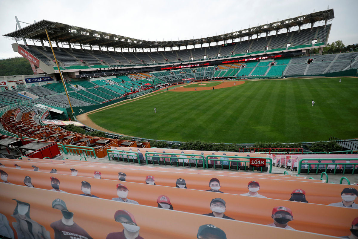 تصاویری از تماشاگران به جای تماشاگران واقعی در جریان یک مسابقه در یک ورزشگاه «بیسبال» قرار داده شده است / کره جنوبی / ۵ مه ۲۰۲۰