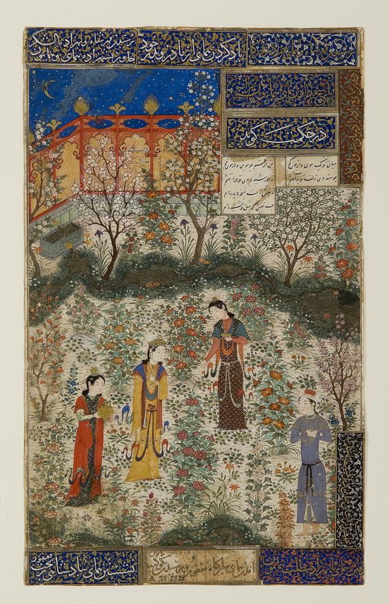 درختان شکوفه سفید و صورتی بر لب جوی خودنمایی می کنند و شکوفه های سفید با ستارگان در آسمان لاجوردی پیوند خورده اند. بخشی از حصار باغ با رنگ قرمز ونارنجی زیر آسمان نیلگون ستارگان و هاله زرین ماه خودنمایی می کند. سرستونهایی از کله شیر که آرایش یال شیران به شعاع های خورشید می ماند به همراه شکوفه های سفید در آسمان لاجوردی جلوه گر شده اند. طبیعت با دو منظر روز و شب که هردوهنگام در اوج زیبایی و شکوه ترسیم شده اند دو دلداده را به شور و سرمستی فرا می خوانند. آن چه از عناصر منظر و طبیعت در این صحنه مشاهده میشود؛ همانا عناصر واقعی و ملموس است که در باغ ها و حیاط های ایرانی وجود دارند.