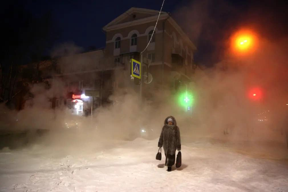 زنی در شهر «امسک» جایی که دمای هوا به منفی ۲۴ درجه سانتیگراد رسیده است قدم میزند / روسیه