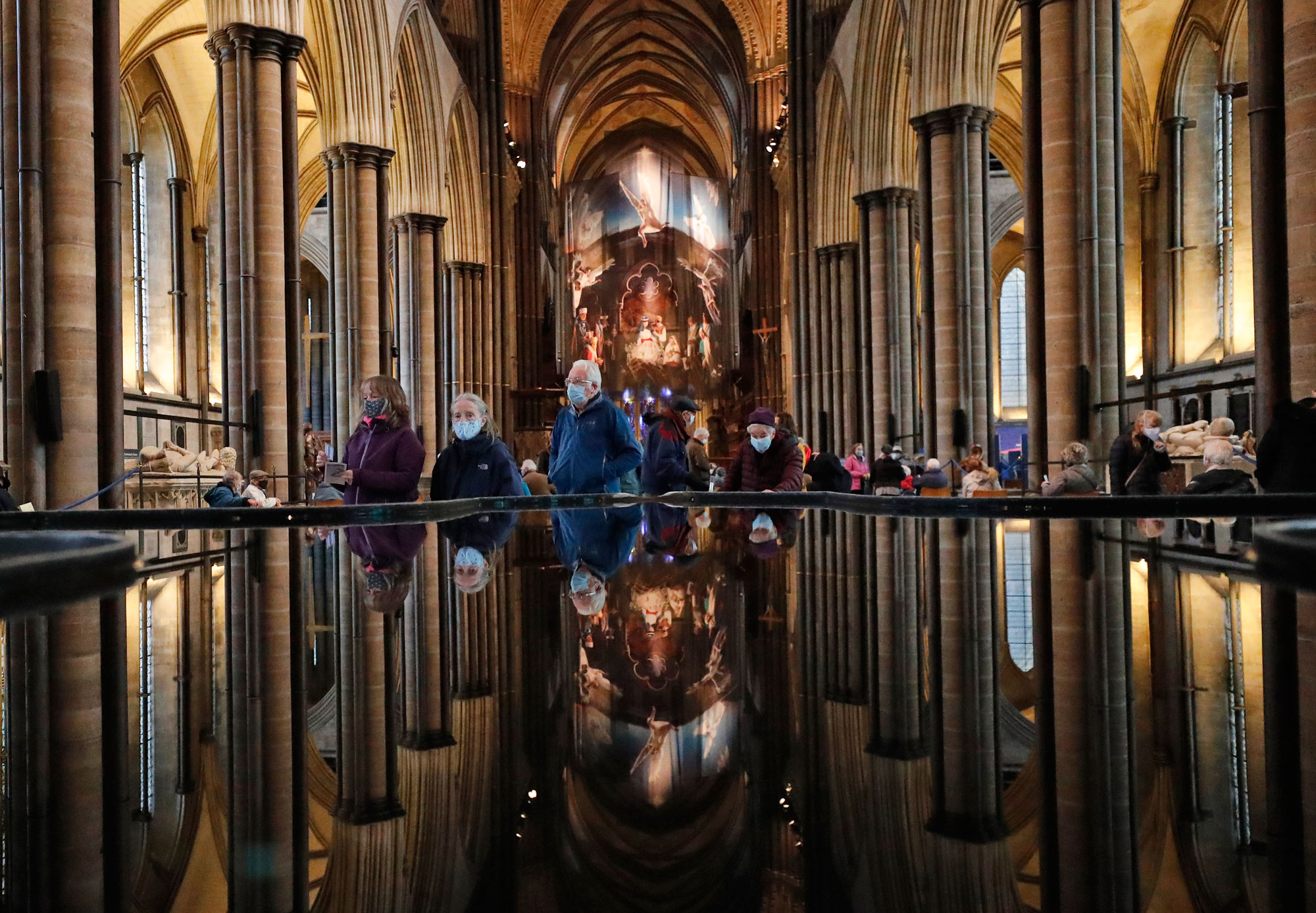 تصویر افرادی که پس از تزریق واکسن «بیونتک/فایزر» کلیسای «سالزبری» را ترک میکنند، بر روی حوض آب بازتاب پیدا کرده است / انگلستان / اسوشیتدپرس
