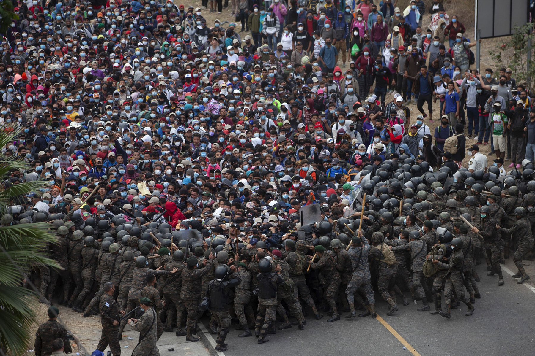 تصویری از برخورد صدها مهاجر با سربازان گواتمالایی در «وادو هوندو». مقامهای گواتمالا تخمین میزنند حدود ۹ هزار مهاجر هندوراسی برای رسیدن به مرز ایالاتمتحده وارد گواتمالا شدهاند / اسوشیتدپرس