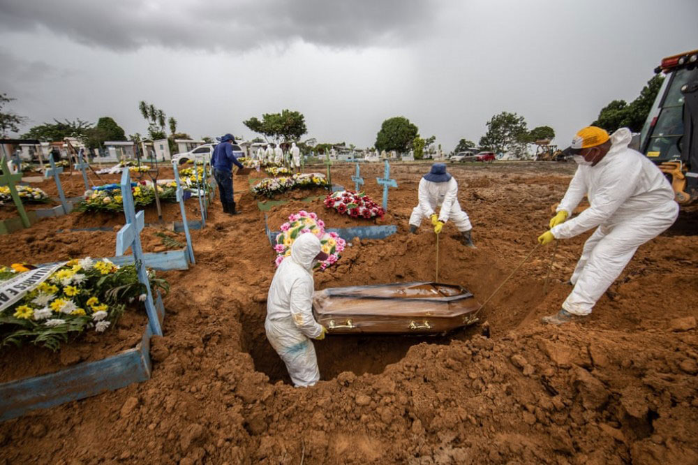 کارکنانی که لباسهای محافظتی بر تن دارند تابوت یک قربانی کرونا را دفن میکنند. کمبود شدید اکسیژن در بیمارستانهای آمازون سبب شده تا مقامهای برزیل قانون منع رفت و آمد را به اجرا بگذارند / «مانائوس» / برزیل / بلومبرگ