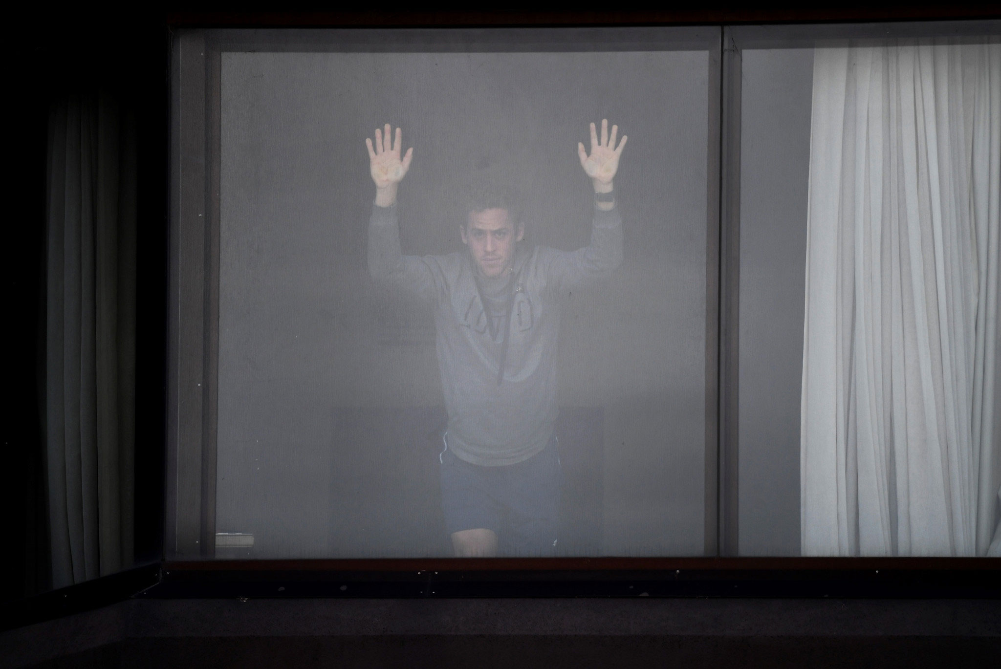 تصویری از یکی از بازیکنان تنیس که در اتاق هتل منتظر حضور در جلسه تمرین است. بازیکنان تنیس باید پیش از آغاز رقابتهای تنیس اوپن استرالیا دو هفته در قرنطینه بمانند / ملبورن / استرالیا / خبرگزاری فرانسه