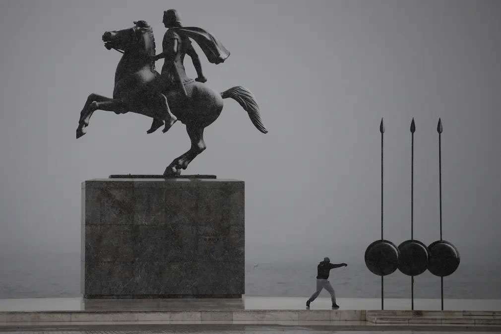مردی در هوای سرد در کنار مجسمه اسکندر مقدونی ورزش میکند / سالونیک / یونان