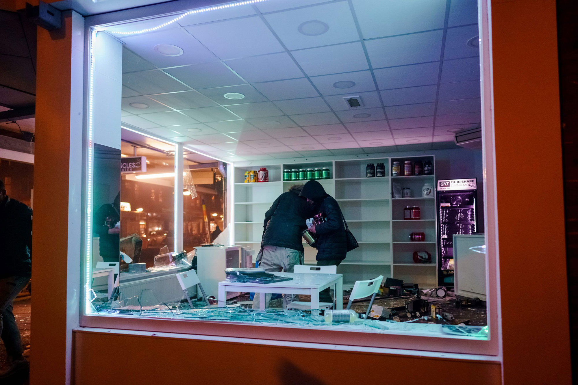 تصویر افرادی که در جریان مقابله پلیس با گروهی از جوانان در «روتردام» کالاهای یک فروشگاه را غارت میکنند. به دنبال اعلام محدودیتهای جدید ناشی از شیوع کرونا در هلند، دومین موج از شورشها در برخی از شهرهای این کشور آغاز شد / روتردام / هلند / خبرگزاری فرانسه