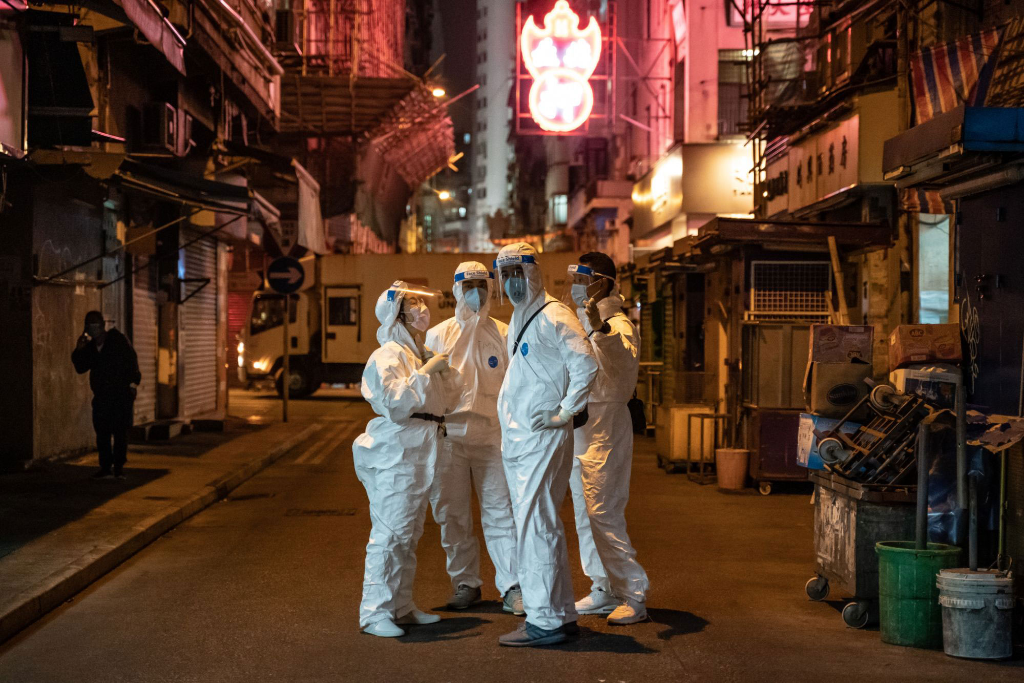 تصویری از کارکنان دولت در منطقه قرنطینه شده هنگ کنگ. دولت هنگ کنگ رفت و آمد دهها هزار شهروند را برای کنترل شیوع ویروس کرونا محدود کرده است / هنگ کنگ / چین