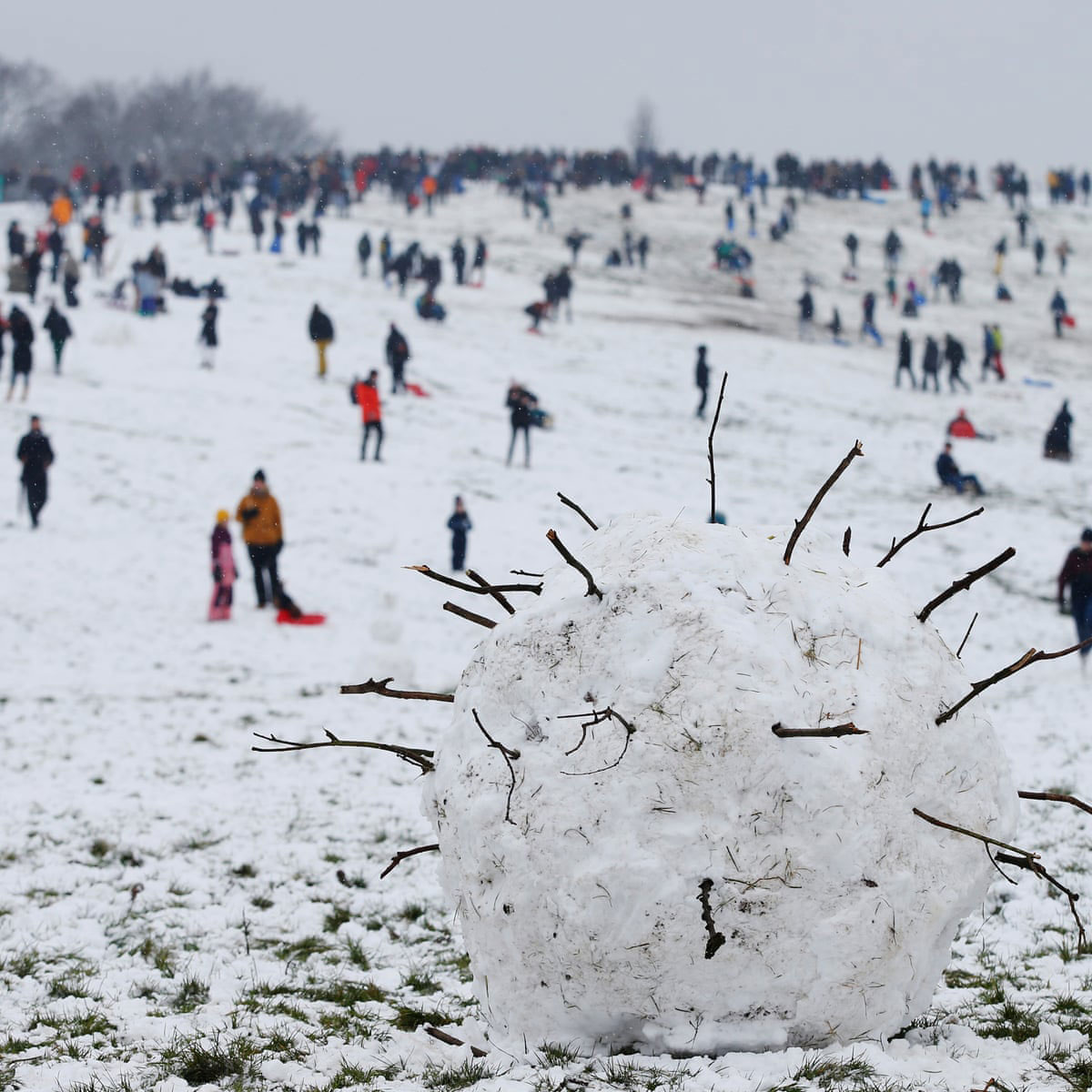 تصویری از مردم در کنار توپ بزرگ برفی که به شکل ویروس کرونا ساخته شده است / لندن / انگلستان