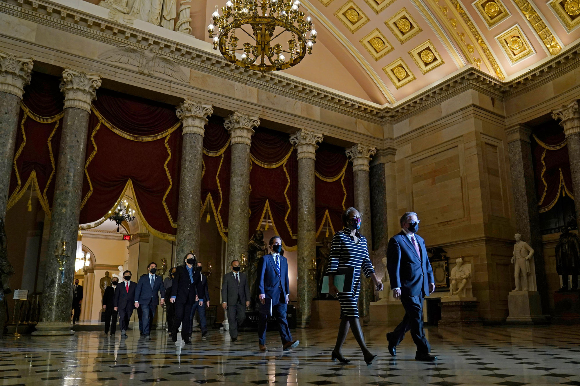 «شریل جانسون»، منشی مجلس نمایندگان آمریکا به همراه نمایندگان با عبور از «تالار مجسمهها» در ساختمان کاپیتول هیل لایحه استیضاح ترامپ را از به مجلس سنا میبرد / واشنگتن دی سی / ایالات متحده آمریکا / اسوشیتدپرس