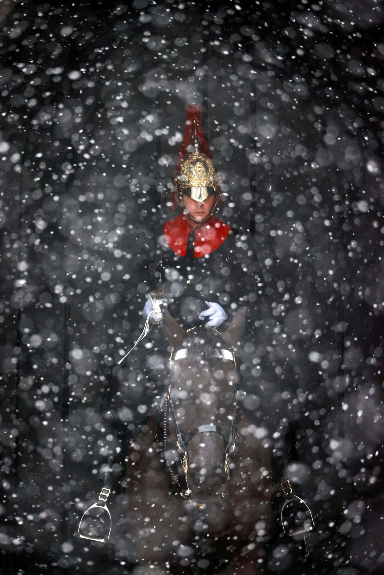 تصویری از یکی از سربازان سوارهنظام حین بارش برف / لندن / انگلستان