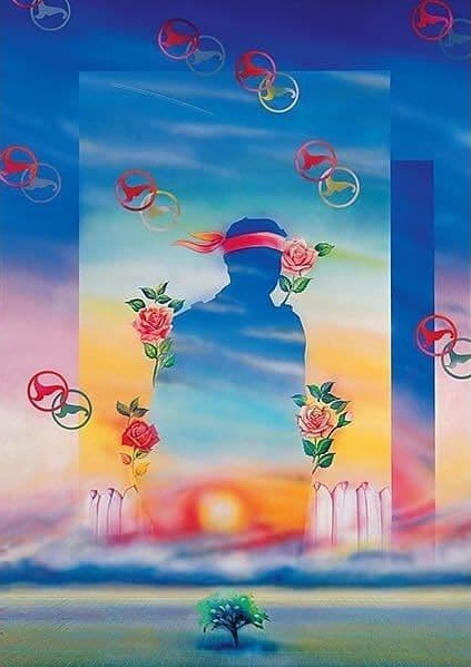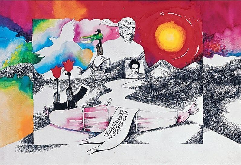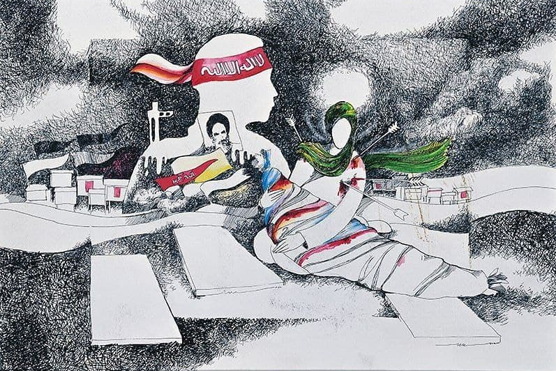 حقیقت این است که من در همین چند کاری که در آنها از نقوش کاشیکاری استفاده کردهام، آنها را به طور مجرد به کار نبردهام و سعی کردهام این نقوش را تغییر فرم بدهم. مثلاً در مقاومت آنها را از زمینه کاشی بیرون آوردم و تلاش کردم که پلی بین تصاویر و نقوش گذشتیمان و تکنیک خودم بزنم. به همین منظور، مثلا آن پَر را که بالای سر بسیجی و در قالب کاشیها آوردم در واقع همان کاشیها هستند که نقششان باز شده است و به حرکت درآمده اند.
