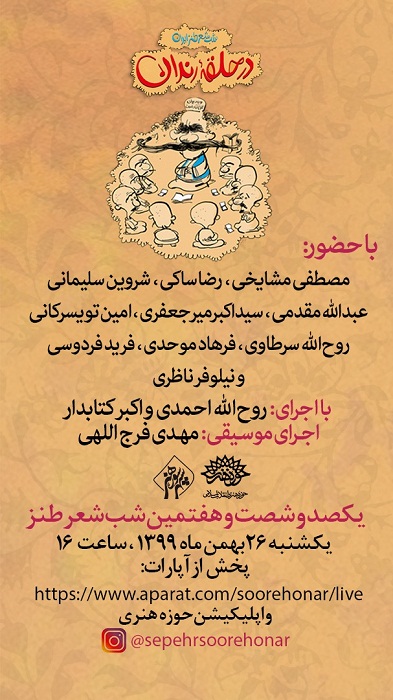 «در حلقه رندان» به همت موسسه فرهنگی و هنری سپهر سوره هنر و دفتر طنز حوزه هنری برگزار میشود. همانگونه که پیش از این گفته شد؛ جهت پیشگیری از شیوع بیشتر بیماری کرونا در حلقه رندان به صورت حضوری پذیرای ادب دوستان گرامی نخواهد بود و علاقهمندان میتوانند این برنامه را به صورت آنلاین از طریق سایت آپارات ببینند.