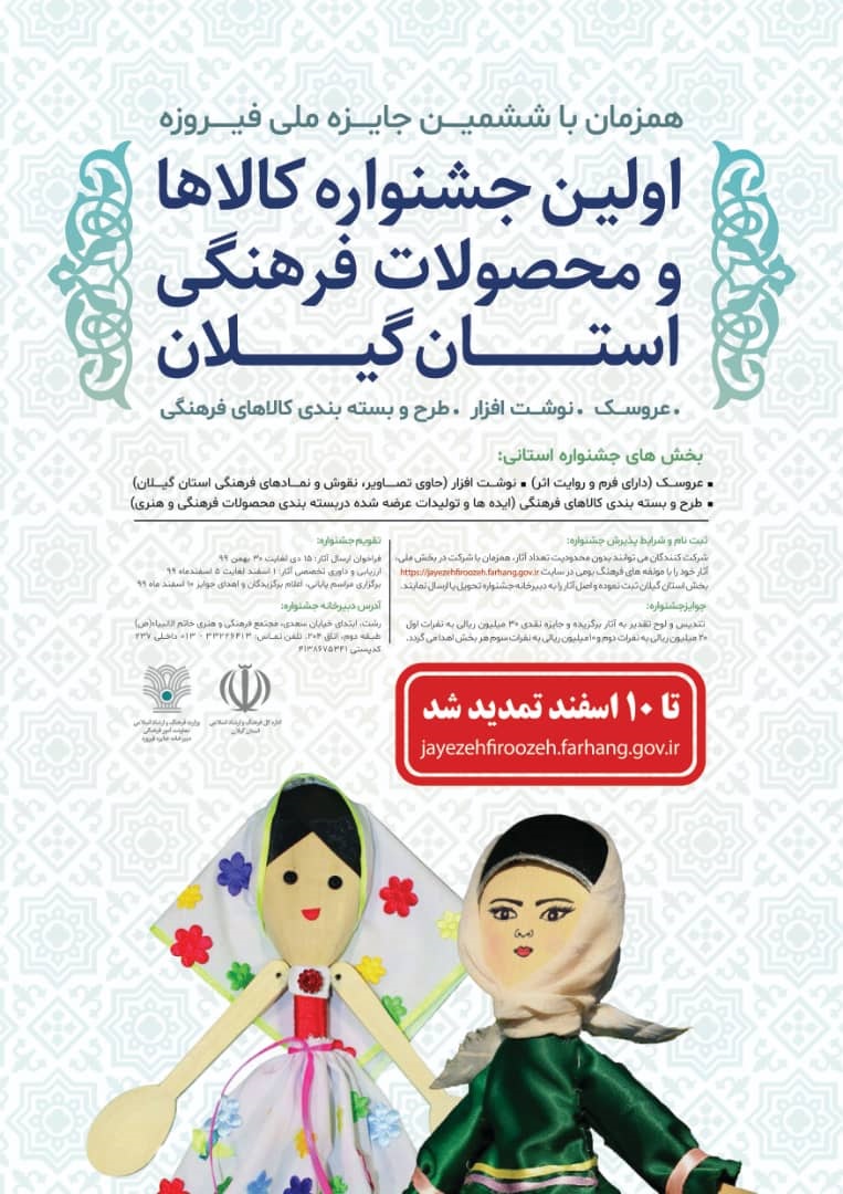 به گزارش روابط عمومی مرکز تجسمی حوزه هنری، نخستین جشنواره کالاها و محصولات فرهنگی استان گیلان در سه بخش «عروسک»، «نوشتافزار» و «طرح و بستهبندی کالاهای فرهنگی» همزمان با ششمین جایزه ملی فیروزه برگزار میشود.