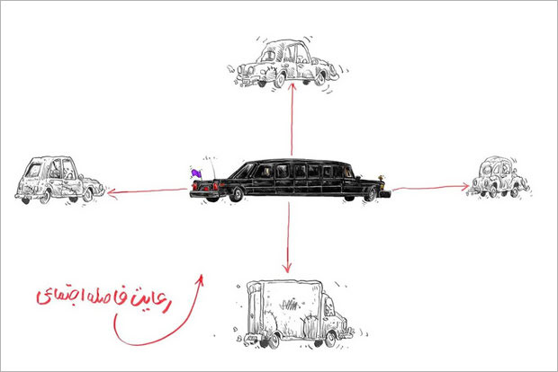 در طرح دیگر نیز چند ماشین با رعایت فاصله از هم در حال حرکت هستند که در واقع طعنهای به طبقه اجتماعی نیز است.