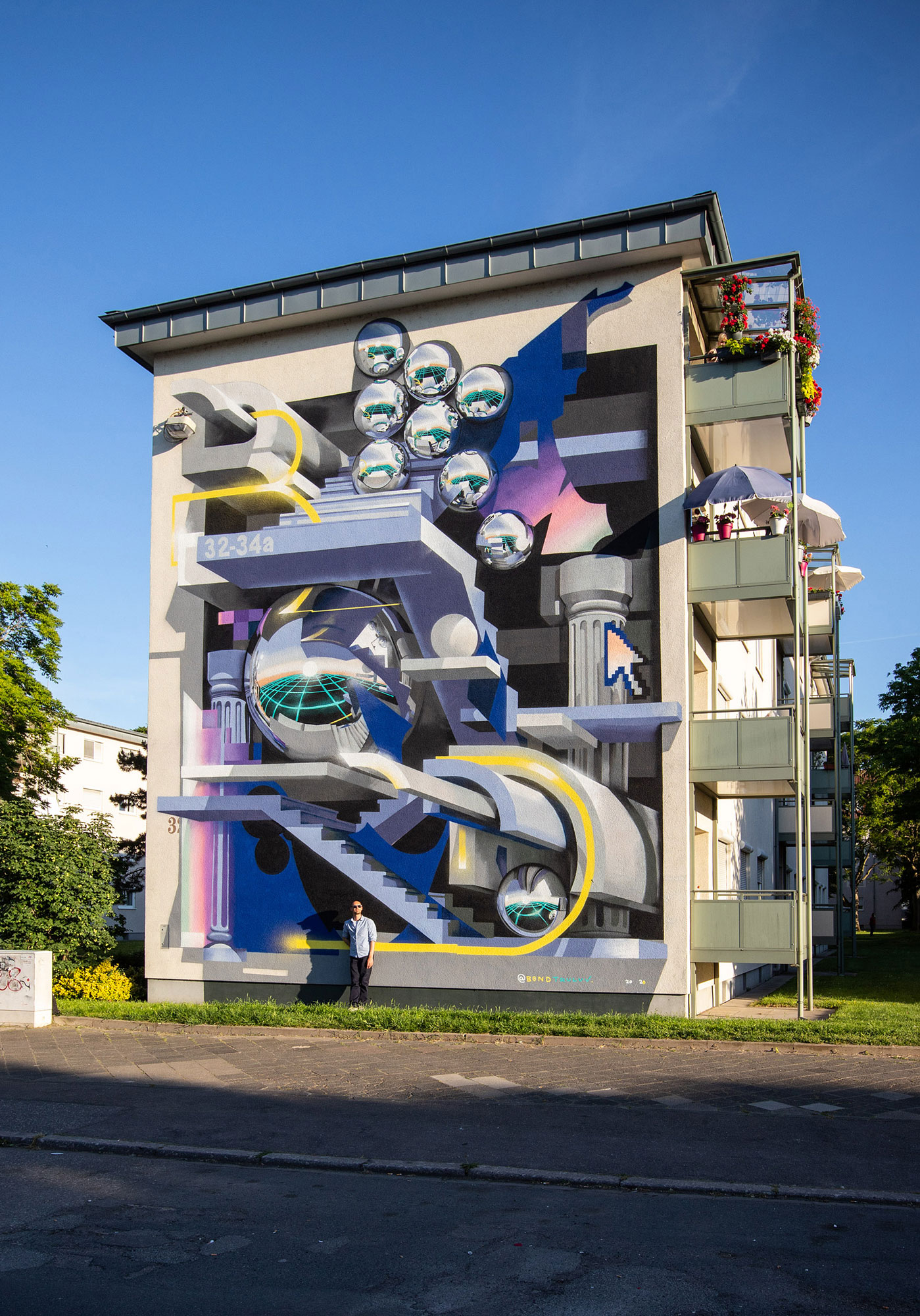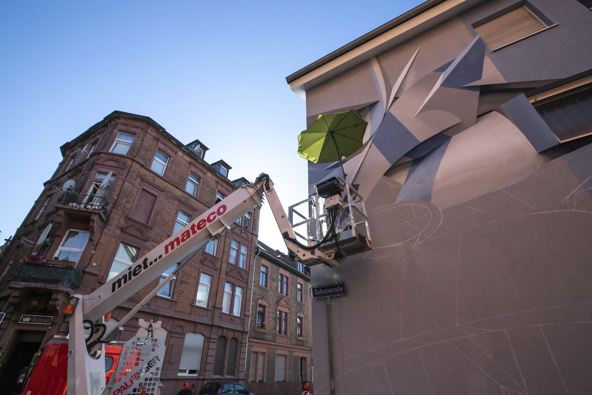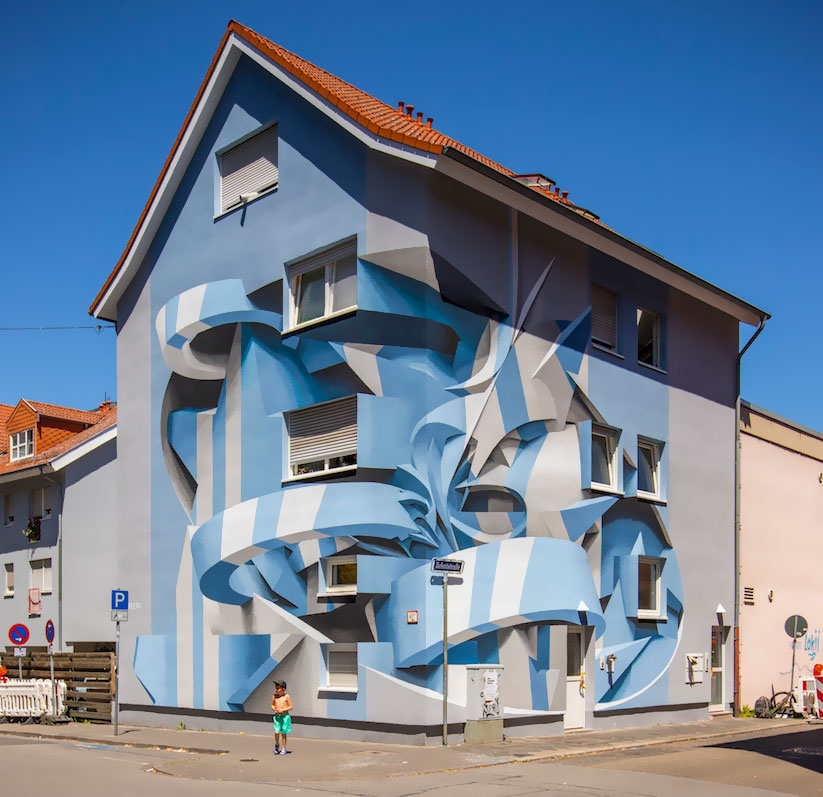 «پیتا» برای پروژه نقاشی دیواری یک طرح هندسی را بر روی یک ساختمان در گوشه خیابانی در مانهایم آلمان طراحی و اجرا کرد. او با استفاده از خطوط تیز، فرمهای منحنی و سایههای مختلف آبی، سفید و خاکستری، لبه سازه را تغییر داده و نمایی به ظاهر غیرممکن خلق کرده است.