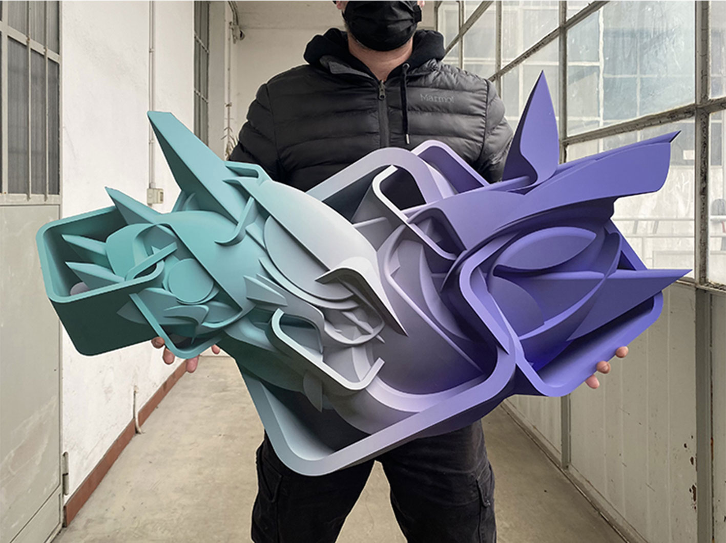 نقش مجسمهسازی که به طور مداوم به موازات فعالیتهای نقاشی دیواری و گرافیتی من اجرا میشود، برای خلق نهایی آثارم ضروری است زیرا برای من نمایانگر تماس مستقیم با حجمهای انتزاعی سه بعدی برای درک قوانین نور و سایهها و ایجاد آنها است.