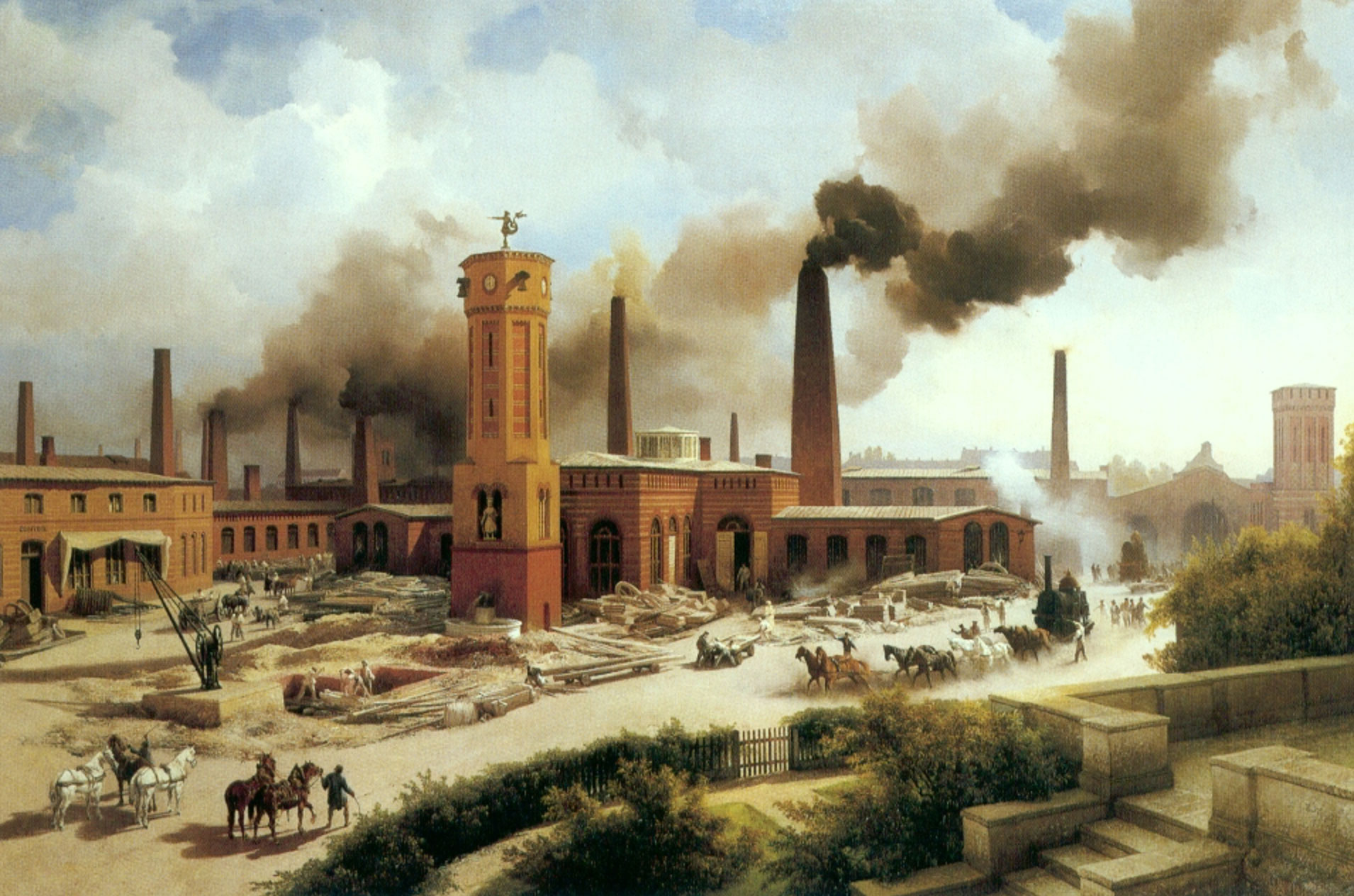تابلو «کارخانه فولاد بورسیگ» از کارل ادوارد برمن نیز یکی از مشهورترین نقاشیهایی است که خطر کارخانههای صنعتی را با دود بزرگی که در نقاشیاش روبه آسمان ترسیم شده و ابزارآلاتی که جای نیروی انسانی را میگیرند، گوشزد میکند.