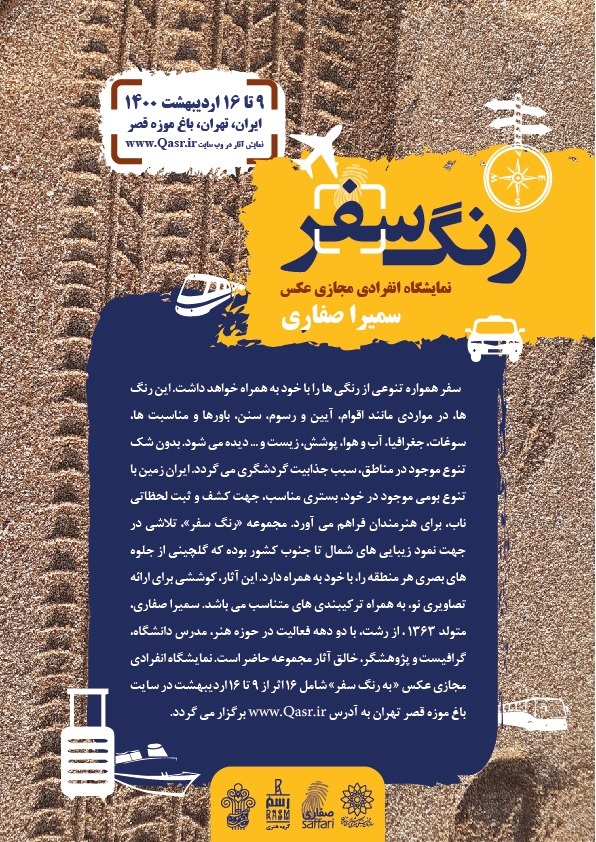 گفتنی است نمایشگاه انفرادی مجازی عکس «رنگ سفر» شامل 16 اثر عکس تا 16 اردیبهشت ماه در سایت باغموزه قصر، www.Qasr.ir برپاست. برگزارکننده نمایشگاه گروه هنری رسم می باشد.