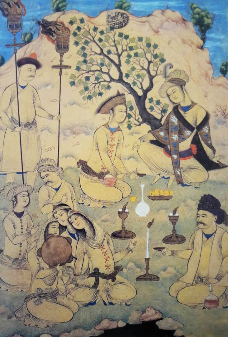 به گواهی شمع ها و مشعل های روشن، زمان شب است اما نقاش با پیروی از قراردادهای نگارگری ایرانی همه جا را روشن کشیده است.