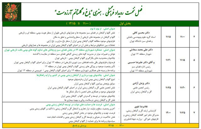 این رویداد مستقل که در هر دوره به یکی از مناطق مختلف ایران فرهنگی تعلّق خواهد گرفت و در فصل نخست به گلها، گیاهان و آثار بومی بافت تاریخی طهران میپردازد، دارای برنامههای جانبی با همکاری دیگر تشکّلهای هنری، تخصّصی و حرفهای مرتبط با گل و گیاه است.